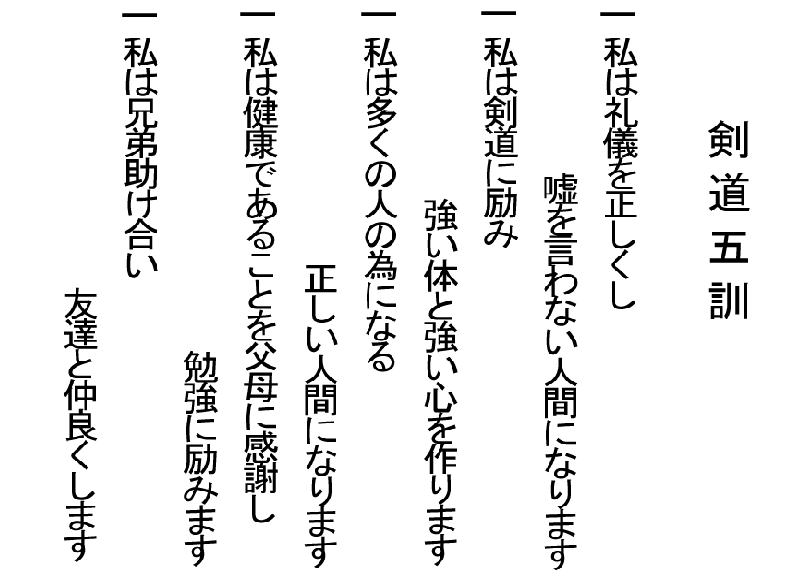 昭和51年の道場設立以来、当道場では少年剣士育成のため、各クラスの稽古において上記の「剣道五訓」を全員で唱和しています。